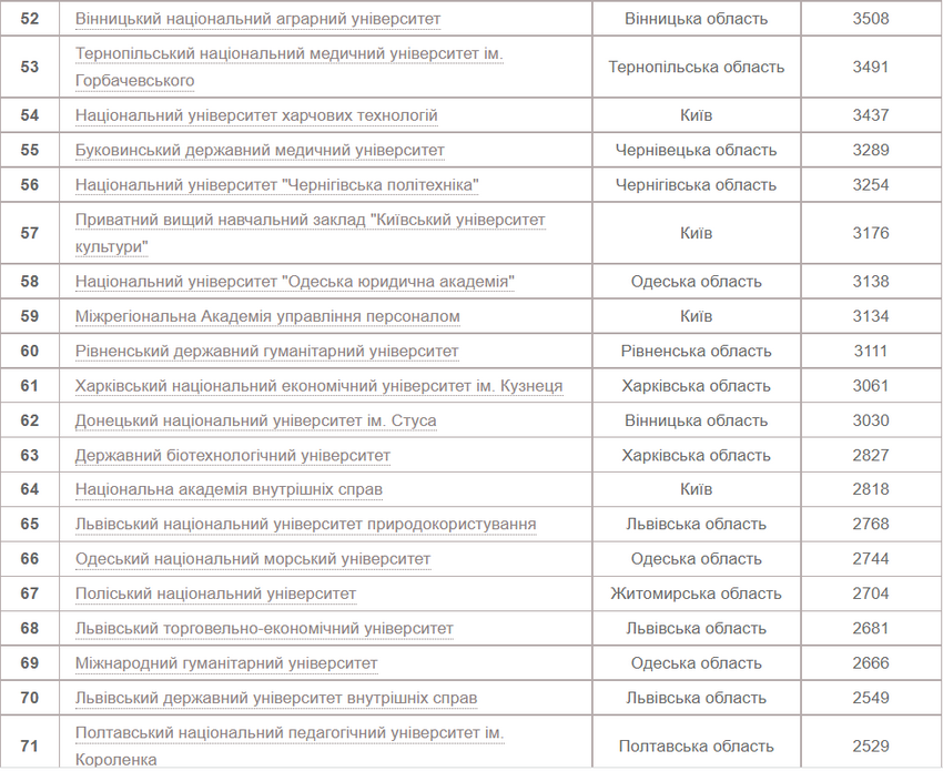 Вінницький національний аграрний університет на 52 місці – 3508 заяв від вступників.
