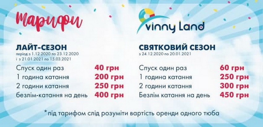 Коли парк відкриють, тут можна замовити як разові катання, так і катання погодинно або замовити безлім на день. В тюбінг-парку «Vinny Land» працюватиме і ярмарок. Цього року гості мали змогу замовити на місці страви та напої одного з ресторанів грузинської кухні.