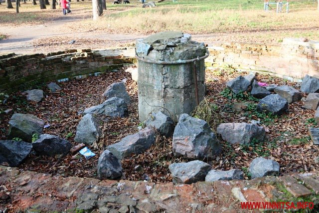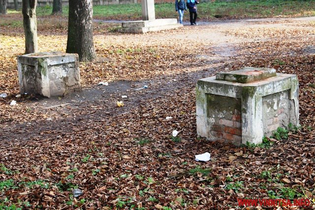 Тут замість вистелених доріжок, протоптані стежки з болотом після дощу. Листя, яке починає гнити. На місці фонтану так і залишається розвалина. Гірка для малюків – погнута, лабіринти і турніки – облущені. Ліхтарі – розбиті…