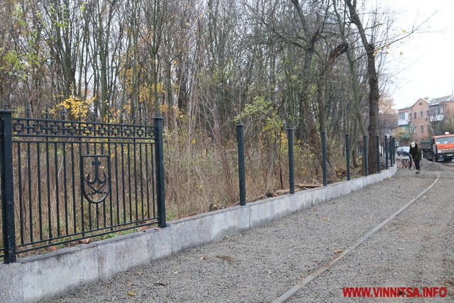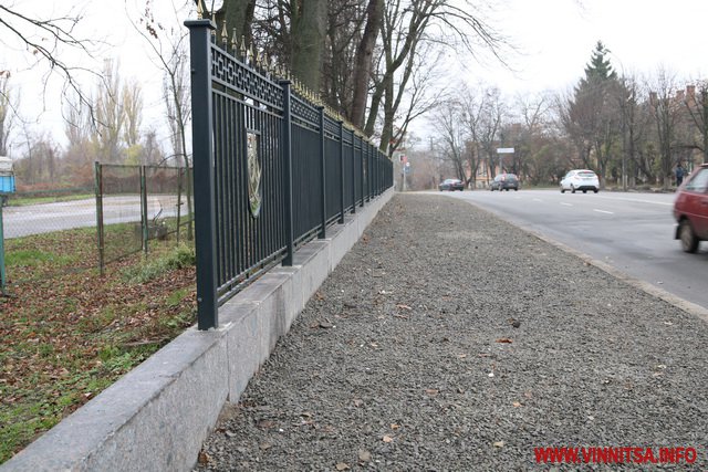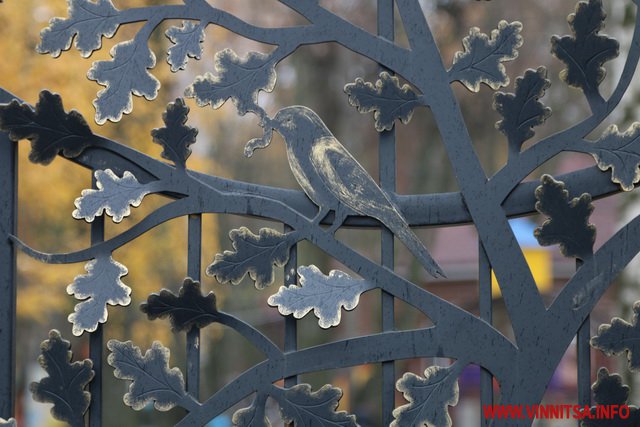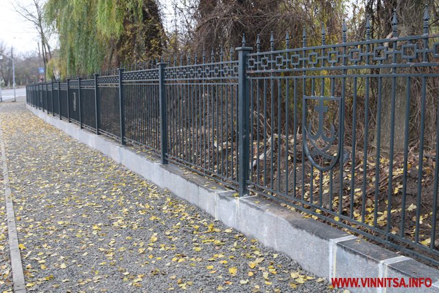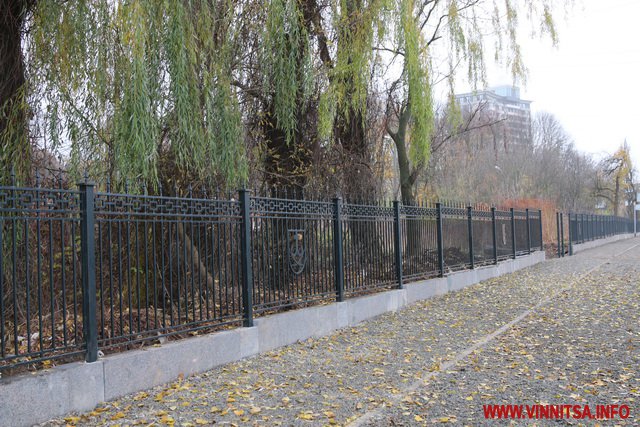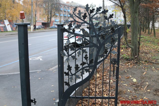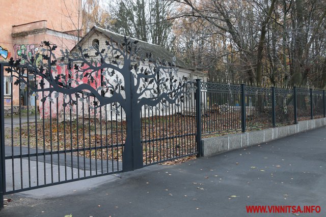 У Вінниці завершують зводити огорожу навколо Центрального парку. По вулиці Магістратській в кількох метрах від початку забору зробили оригінальні ворота у вигляді дерева, трохи далі встановили дві фіртки в цьому ж стилі.