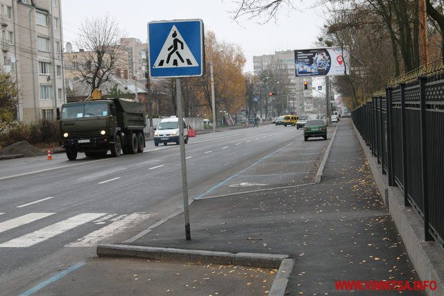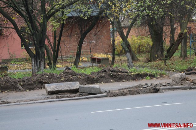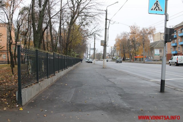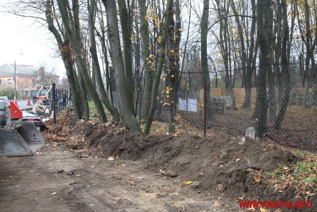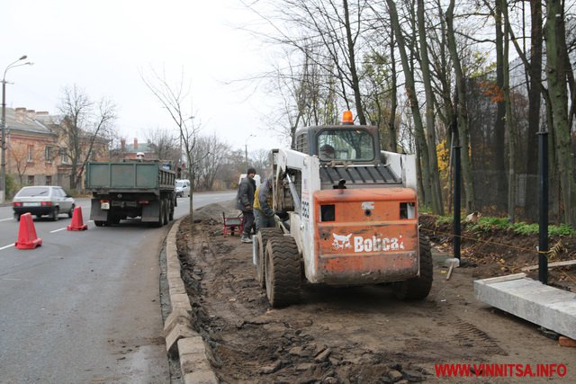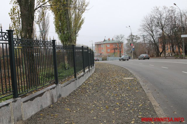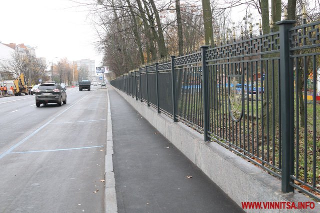 10 листопада зранку робітники працюють навпроти будинку №146 по вулиці Магістратській. Вони знімають старі бордюри та облаштовують нові, засипають щебнем територію, де буде велодоріжка та пішохідна зона. На місці старого цегляного паркану монтують нову металеву огорожу з гербом Вінниці.