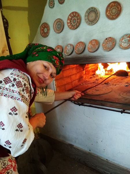 «А потім на дерев’яну лопатку і в п’єц (пічка на місцевій говірка). Якщо вона гарно розпечена, за п’ять хвилин млинець на черені готовий», - зауважує.