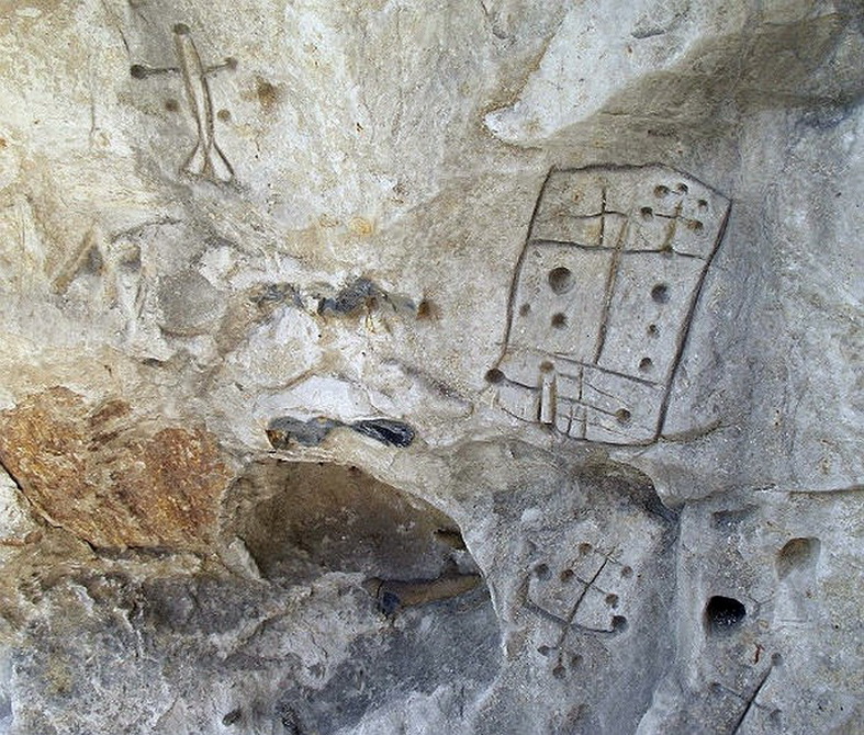 Як пише Міжнародний інститут Афонської спадщини, на стінах розташовані петрогліфи та графіті, зображені на стінах комплексу та у його печерах, є артефактами міжнародної ваги та не мають аналогів у світі. Серед зображень – хрестоподібні фігури, трикутники, ромби, зображення звірів, риб, птахів. Усього таких знаків – сотні.