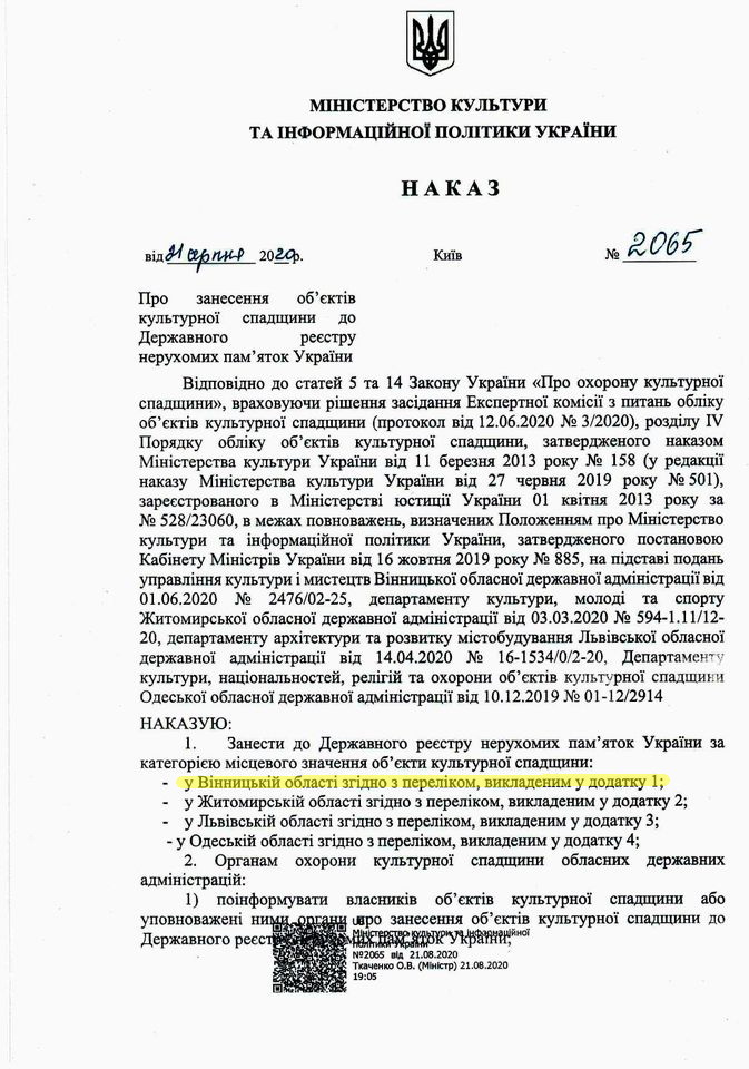 «Наказом Міністерства культури та інформаційної політики України від 21.08.2020 р. №2065 занесений до Державного реєстру нерухомих пам'яток України Архітектурному комплексу статус пам’ятки національного значення, а отже і охорону держави, завершені», – йдеться на сторінці Пам’ятки культурної спадщини Вінниччини.