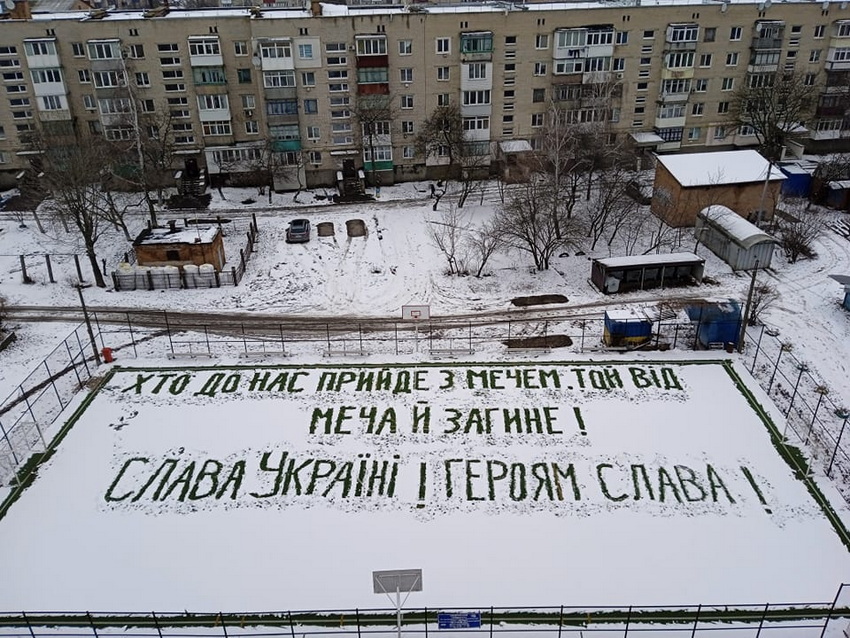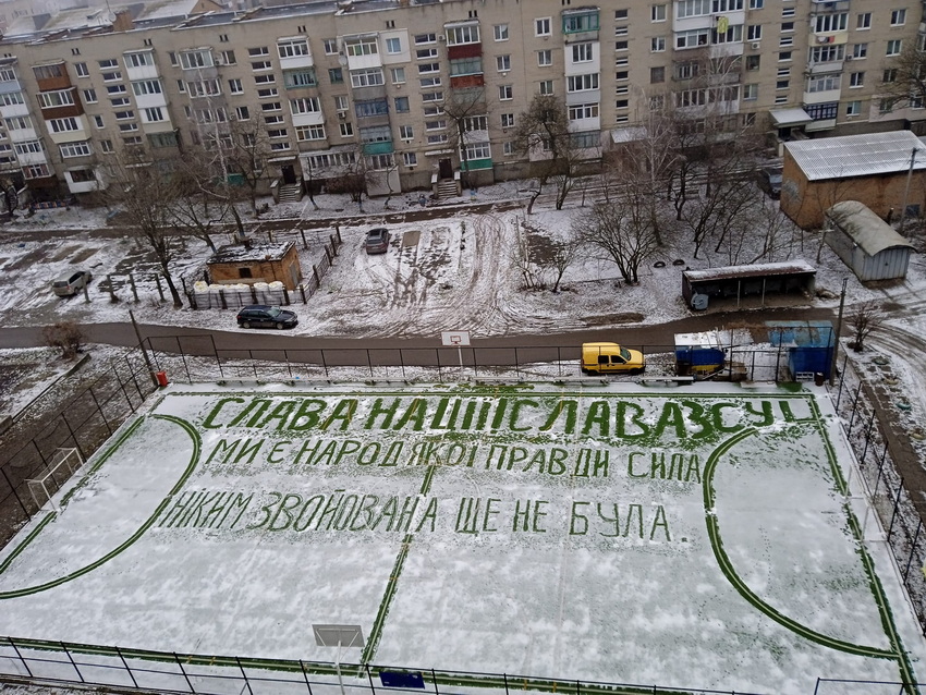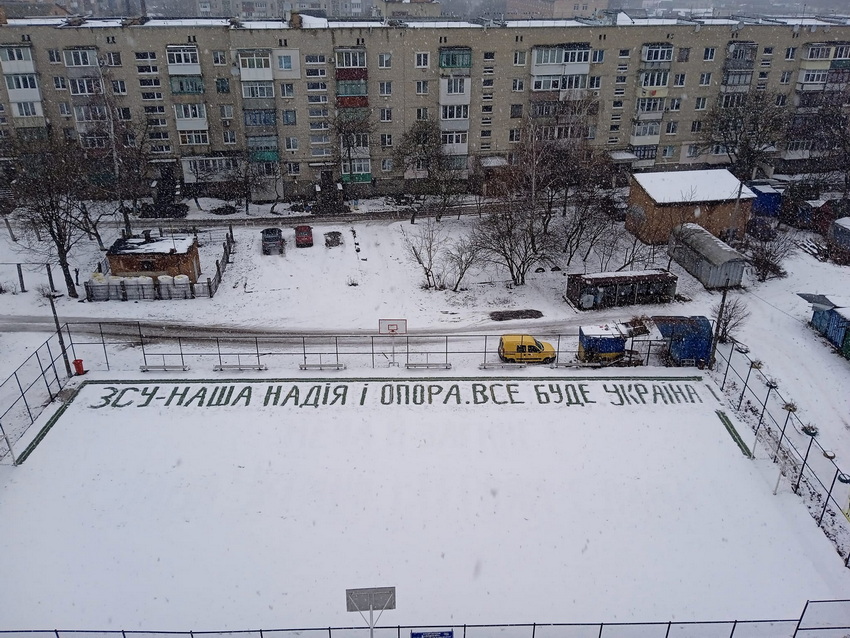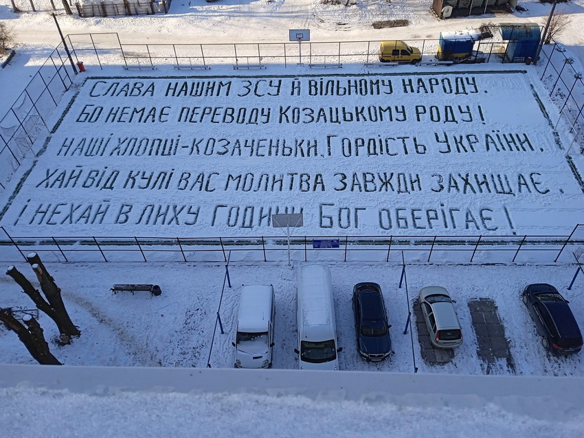 Мій перший надпис був «Слава нації! Слава ЗСУ!». Коли футбольне поле вкривав новий сніг, з’являлися нові — «Україна понад усе», цитати з віршів, «Ми є народ, якого правди сила ніким звойована ще не була», «Слава нашим ЗСУ й вільному народу. Бо немає переводу козацькому роду…»,  «Хто до нас прийде з мечем, той від меча і загине» тощо. Всього було 17 надписів», - розповідає Вінниця.info Петро Чорний.