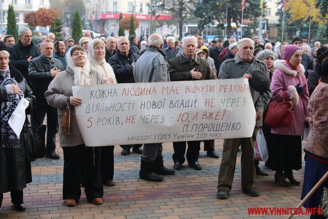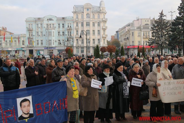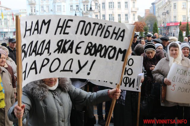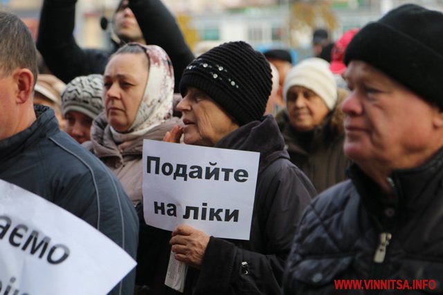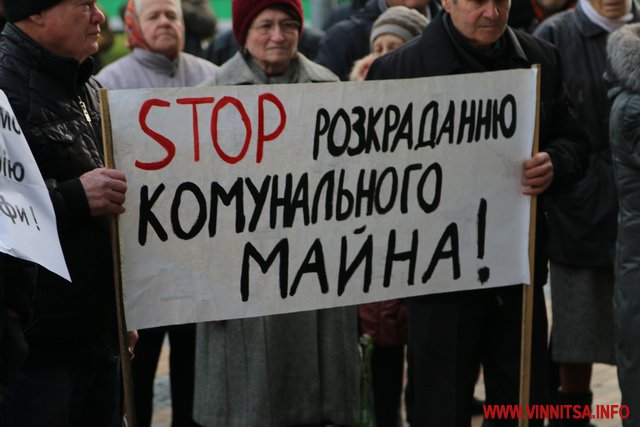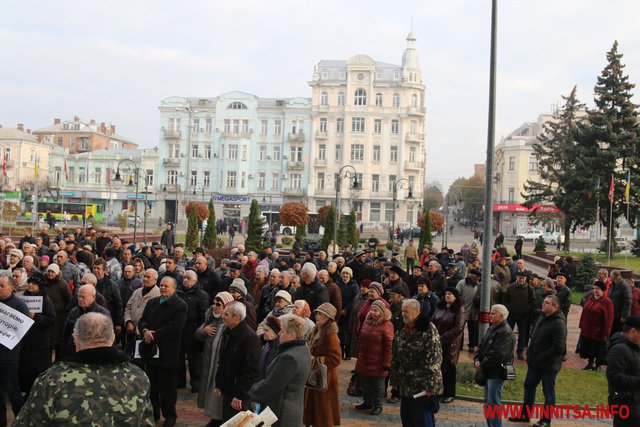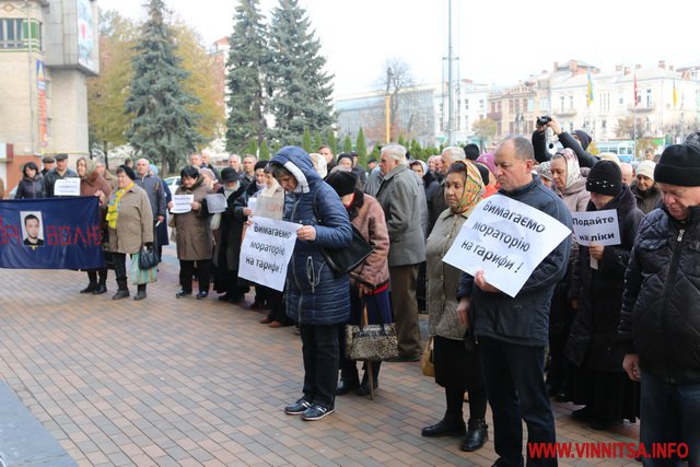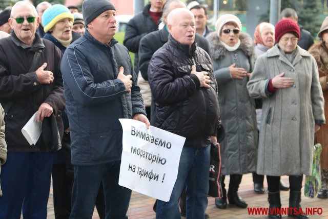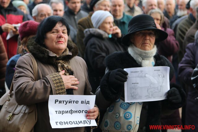 Як відомо, сьогодні на 10 годину ранку запланована сесія Вінницької міської ради. Люди які вийшли на Майдан Незалежності, переважно пенсійного віку. Але вимоги до влади, які в них на плакатах різні: одні написали плакати «Вимагаємо мораторію на тарифи», інші – «подайте на ліки», ще є плакат «Стоп розкраданню комунального майна», «Нам не потрібна влада, яка є ворогом народу»…