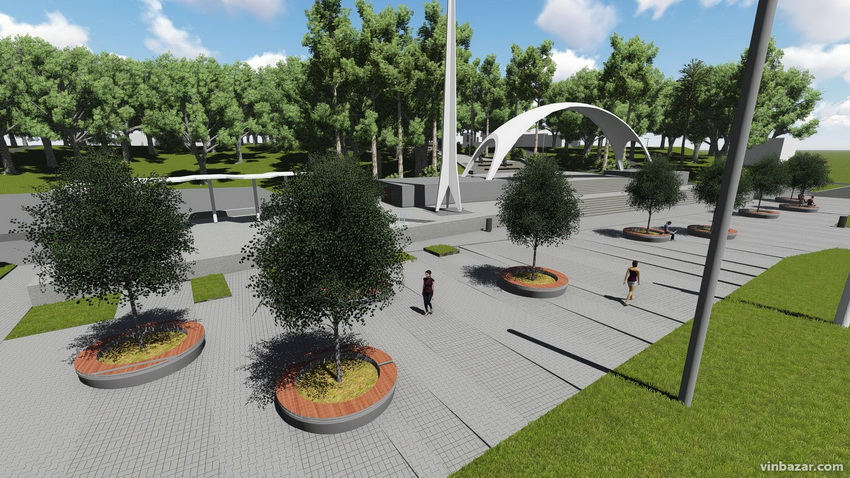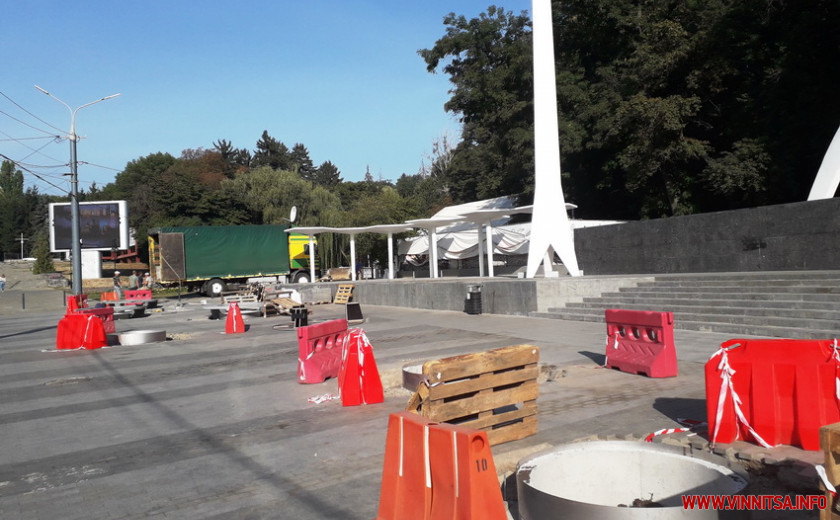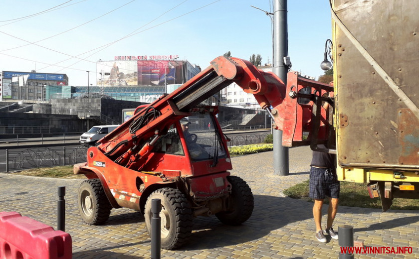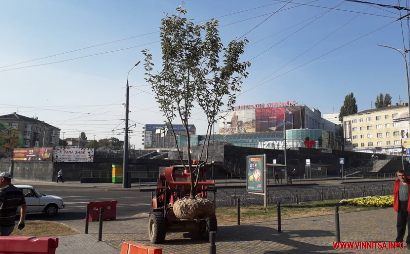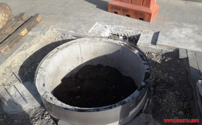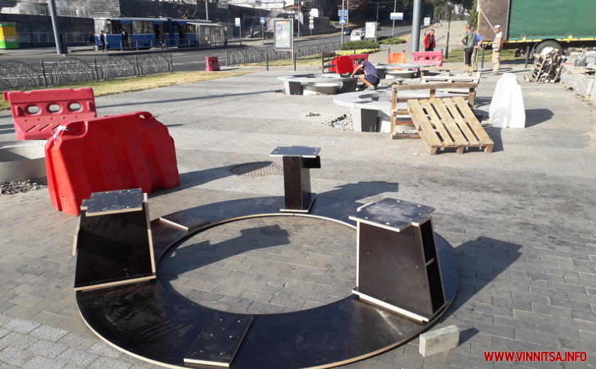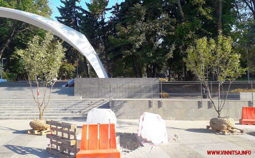 Нещодавно у Вінниці почали облаштовувати територію перед Аркою. Спочатку там розібрали частину плитки і створили місце для майбутньої посадки дерев. 11 вересня, зранку, робітники монтують круглі основи під лавочки та розвантажують саджанці.