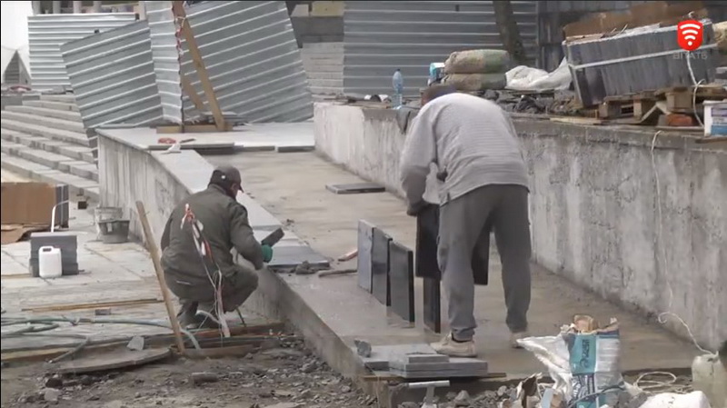 Викладають гранітні плити, вагою майже 10 кілограмів. Також поруч встановлюють паркан від дороги, заливають стійки бетоном.