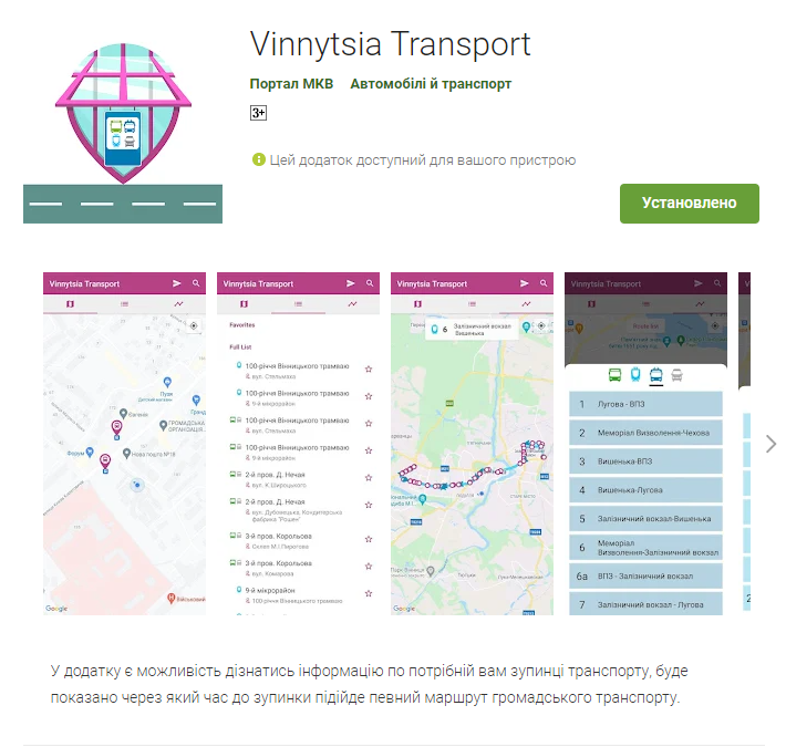 Мобільний застосунок «Транспорт Вінниці» призначений для визначення місця розташування трамваїв, тролейбусів, автобусів, маршрутних таксі на карті; відображення часу їх прибуття на обрану зупинку; пошуку найближчих зупинок за місцем розташування користувача, а також візуалізації маршрутів транспорту. Інформація додатку дублюється з даними інформаційних табло, які розташовані на зупинках Вінниці.