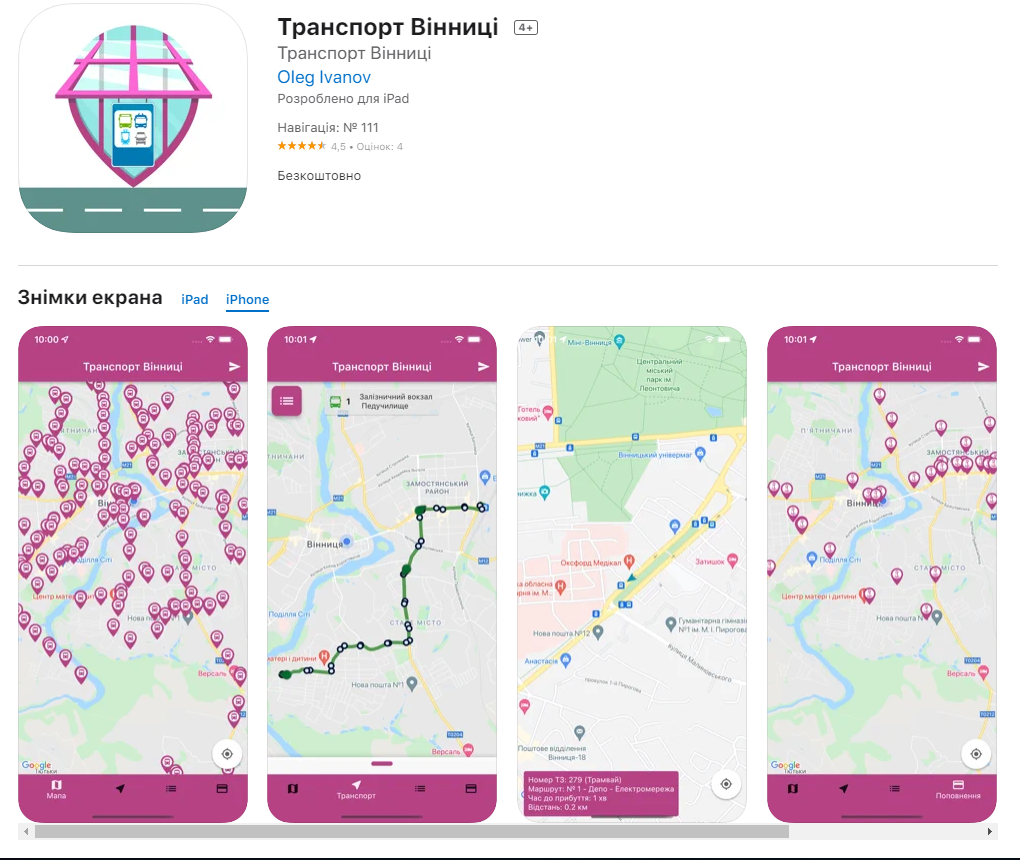 Мобільний застосунок безкоштовний. Він доступний і для системи Android (скачувати через Play Маркет), і для iOS (завантажити можна через App Store). Також можна скористатись розділом «Мобільні застосунки» сайту «Муніципальна карта вінничанина»: https://et.vn.ua/apps