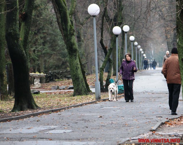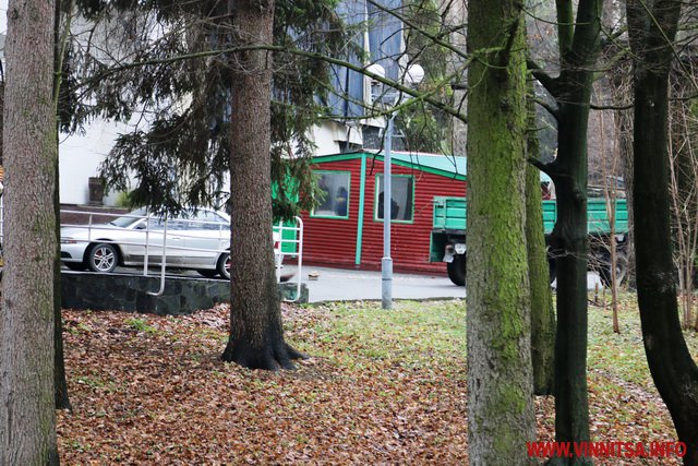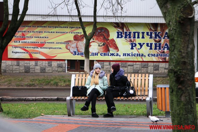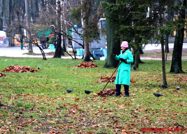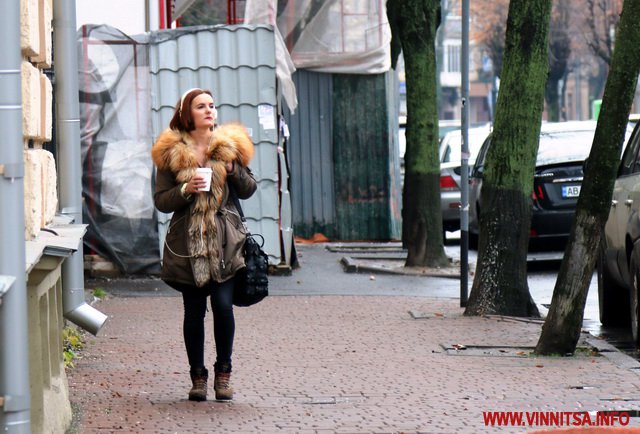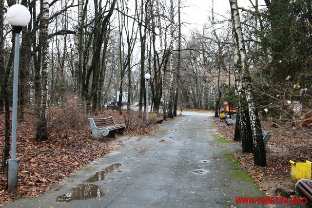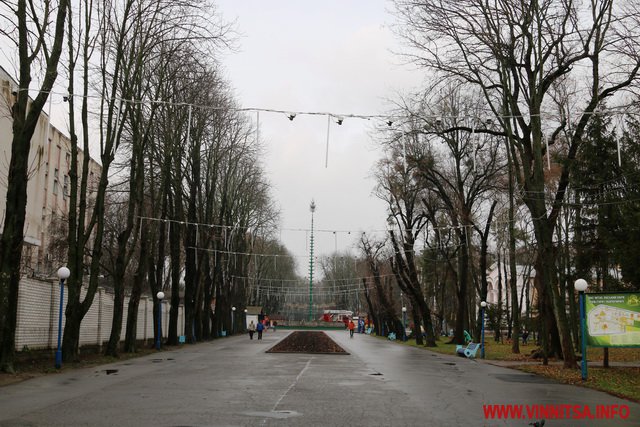Сьогодні у Вінниці про зиму нагадують хіба що пухнасті шуби на дівчатах, афіші новорічних концертів та ілюмінація. У центральному парку, монтують головну ялинку, поруч – комунальники згрібають листя… На деревах – годівнички для птахів. Біля «Райдуги» «заховався» будиночок Діда Мороза. Калюжі. Хмарно.