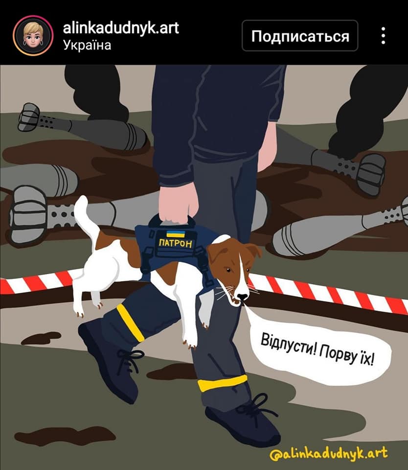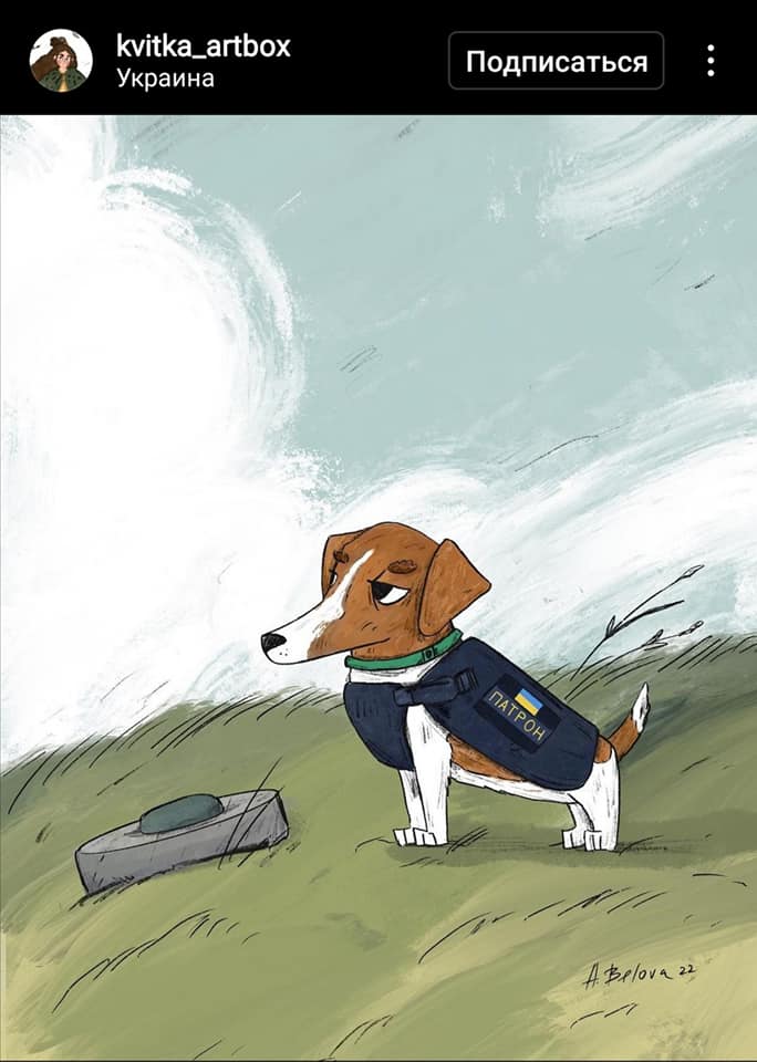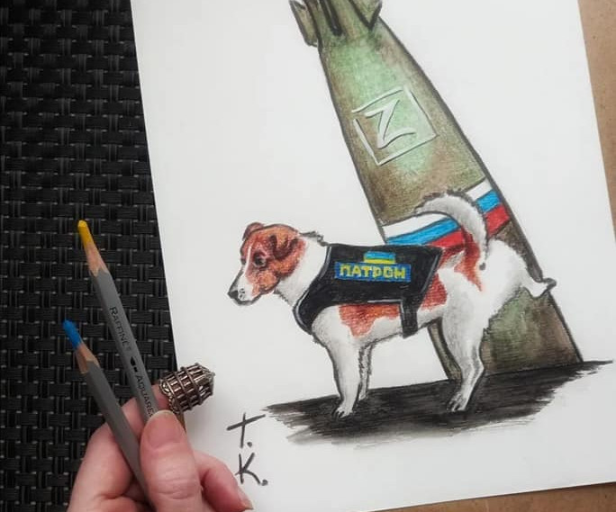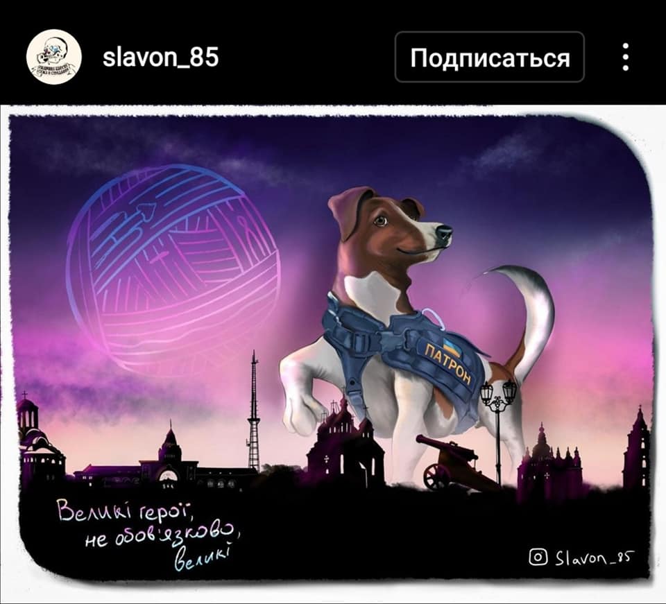 Пес Патрон, який на Чернігівщині допомагає розмінуванню, надихнув неймовірну кількість талановитих художників. З початку війни песик допоміг знешкодити понад сотню вибухонебезпечних предметів, зберігши життя сотням людей й самим саперам. Тож, не дивно що цей талісман рятувальників став зіркою інтернету та героєм милих малюнків.