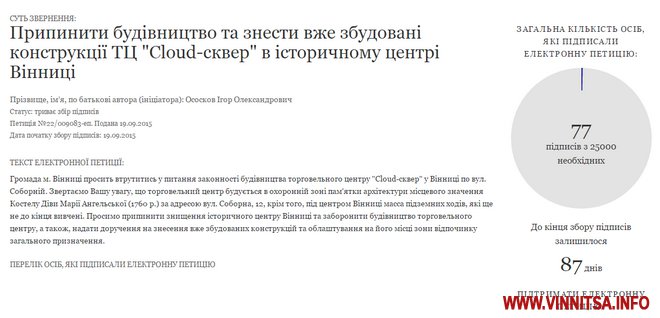 «Громада м. Вінниці просить втрутитись у питання законності будівництва торговельного центру «Cloud-сквер» у Вінниці по вул. Соборній. Звертаємо Вашу увагу, що торговельний центр будується в охоронній зоні пам'ятки архітектури місцевого значення Костелу Діви Марії Ангельської (1760 р.) за адресою вул. Соборна, 12, крім того, під центром Вінниці масса підземних ходів, які ще не до кінця вивчені. Просимо припинити знищення історичного центру Вінниці та заборонити будівництво торговельного центру, а також, надати доручення на знесення вже збудованих конструкцій та облаштування на його місці зони відпочинку загального призначення», - йдеться у зверненні до Порошенка.