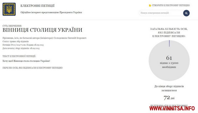 Але є петиції бувають різні, зокрема, Євгеній Солодовник пропонує зробити Вінницю столицею України.