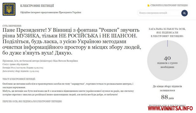 Інший автор петиції – Наталя Біда просить Порошенка поділитьсь досвідом, як очистити інформпростір від російського шансону, бо на набережній «Рошен» у Вінниці звучить патріотична музика, а в маршрутках чути в основному шансон.