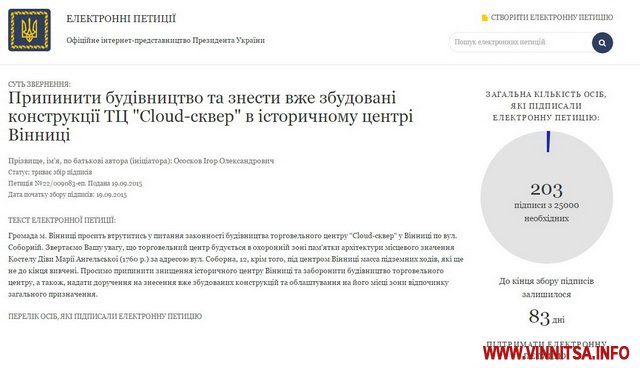 А Ігор Ососков пропонує припинити будівництво ТЦ «Cloud-сквер» в історичному центрі Вінниці. Поки що ця петиція набрала найбільшу кількість підписів - 203, серед тих, що стосуються Вінниці.