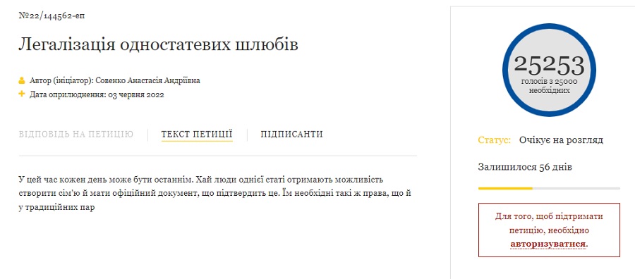 Петиція №22/144562-еп про легалізацію одностатевих шлюбів в Україні набрала понад 25 тисяч підписів. Тепер її має розглянути Президент України.
