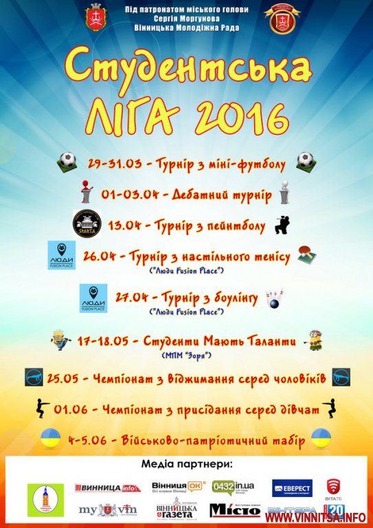 З 29 березня у Вінниці стартує проект «Студентська ліга 2016». Він включатиме ряд молодіжних заходів, серед яких турніри по міні-футболу та пейнтболу, чемпіонат з віджимання серед чоловіків та присідання серед жінок, конкурс «Студенти мають таланти» та інше.