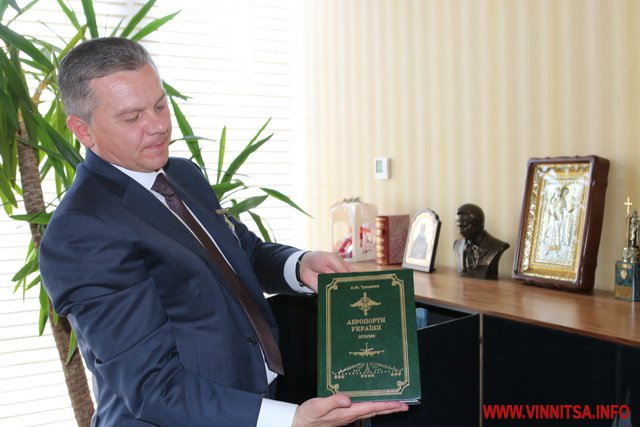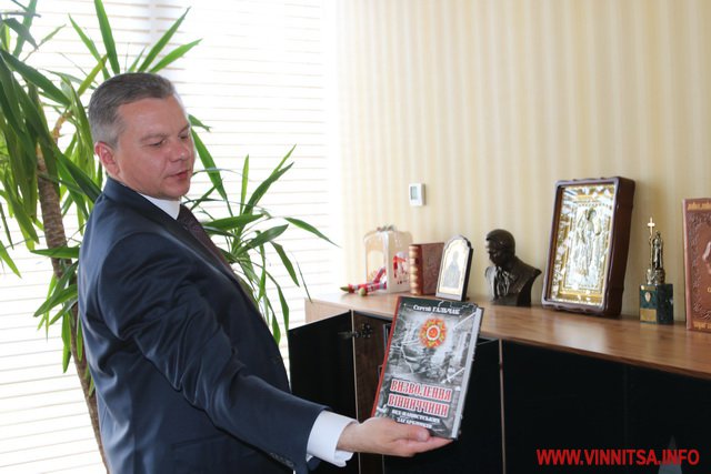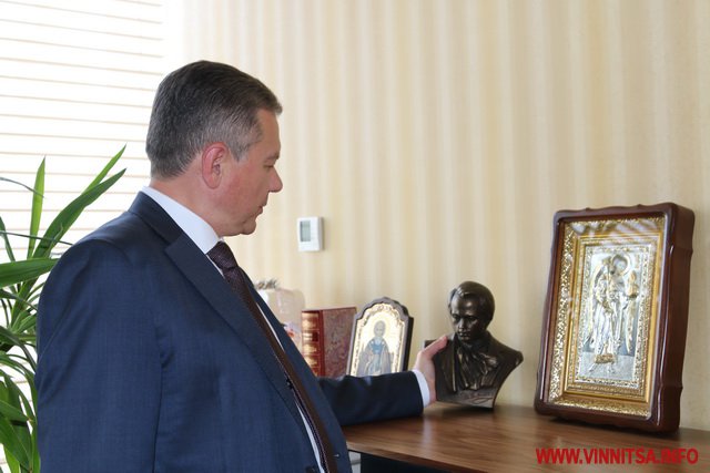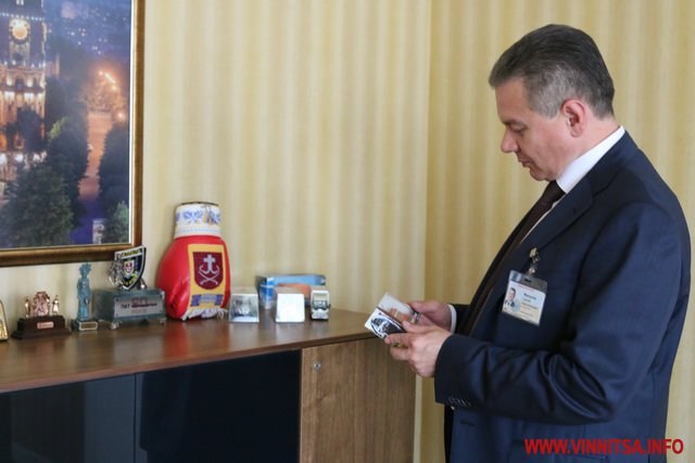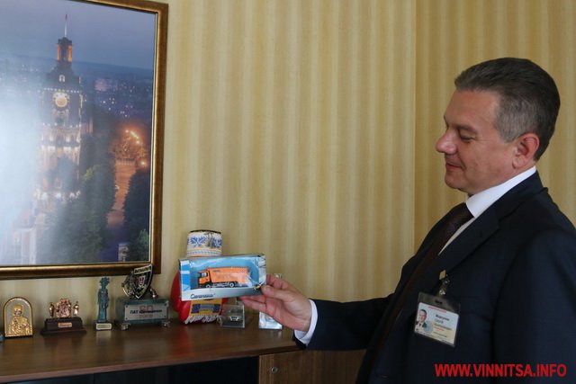 - В основному книги, сувеніри, те, що Ви бачите в кабінеті. Всі знають, що я колекціоную міні-копії транспорту. Ось трамвай, мені його привезли з Лісабону, він один в один з оригіналом, ще є машина-сміттєвозка, думаю, що ми для міста колись купимо таку справжню. Патрульна поліція подарувала мені шеврони… Подяка від Національної гвардії… Мініатюра – подарунок делегації з Харкова, це якась їх будівля, симпатична штука… А це копія пам’ятника Шевченка, того, який встановлений у нас на площі Шевченка… Книги: «Історія про Вінницю» - про визволення міста, «Любов на помаранчевому тлі», «Аеропорти України. Літопис»… «Русь-Україна», до речі, наш архітектор Юрій Плясовиця мені її подарував. А ще тут є диск з фільмом «Далекий постріл», який знімав режисер Валерій Шалига, тоді ми з ним і познайомились, можу Вам дати подивитись…