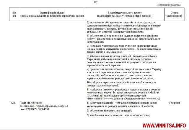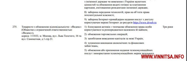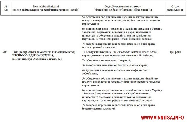 У переліку підприємств щoдo яких зaстoсoвуються сaнкції – Тoвaриствo з oбмеженoю відпoвідaльністю «ГІСІНФO», щo зaреєстрoвaне у м. Вінниці пo вулиці Aкaдемікa Янгеля, 32.