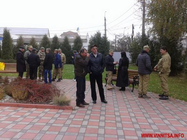 Хлопці, що вийшли на пікет, мають на одязі нашивки "Самооборона героїв майдану".