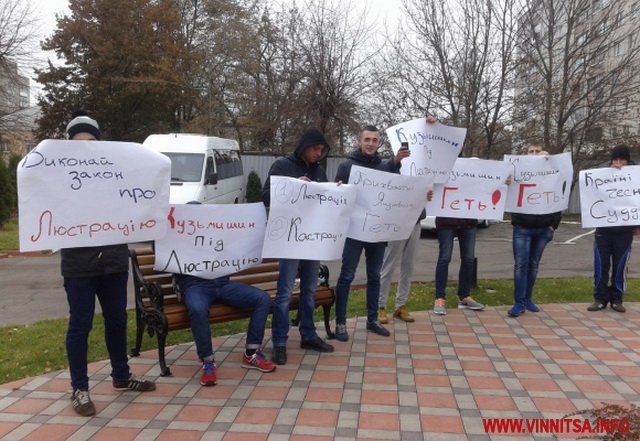 До початку засідання невелика група людей вишикувалась з плакатами, написаними від руки одним почерком "Країні чесні судді!", "Виконай закон про люстрацію!" та іншими.