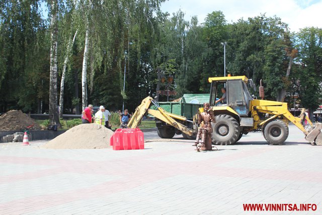 Представлятися жоден з ремонтників відмовився. На одній з машин, які з’їхалися на площу, є логотип «Вінницяводоканал».