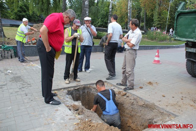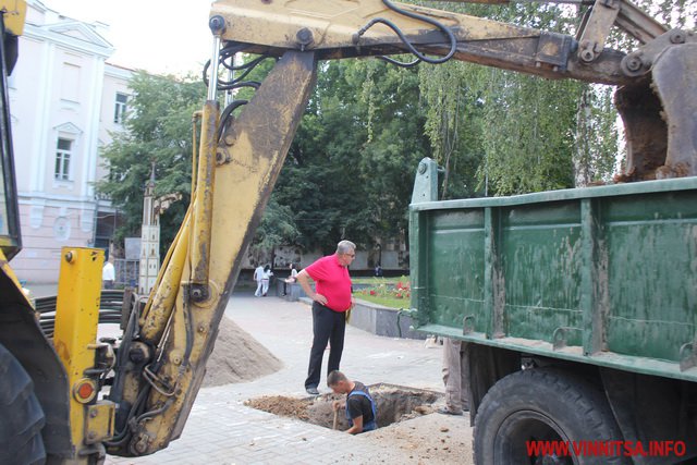 5 липня близько 15.30 у Вінниці на Європейській площі під Вежею бригада ремонтників спецмашинами вирили котлован. Оглядають труби, які прокладені під землею. На запитання журналіста, що відбулося, працівники відповідати відмовилися.