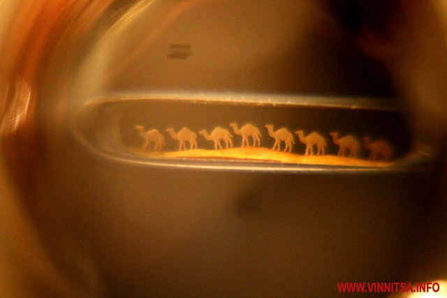 Караван верблюдів у вушку голки. Верблюди зроблені із слонової кістки і поміщені у вухо швацької голки. Вага кожного верблюда не перевищує 0,003 г