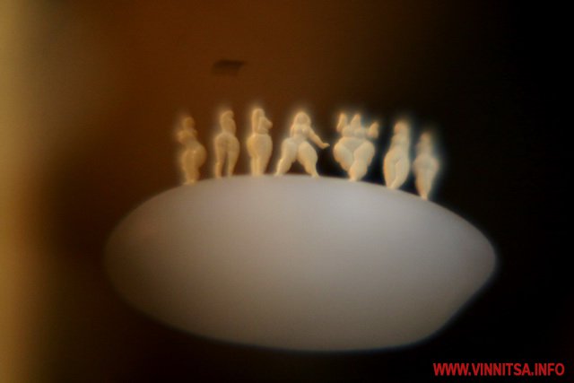 Міс «Товстушка». На рисовому зерні поміщені 7 мікроскульптур, вирізьблених з бивня мамонта
