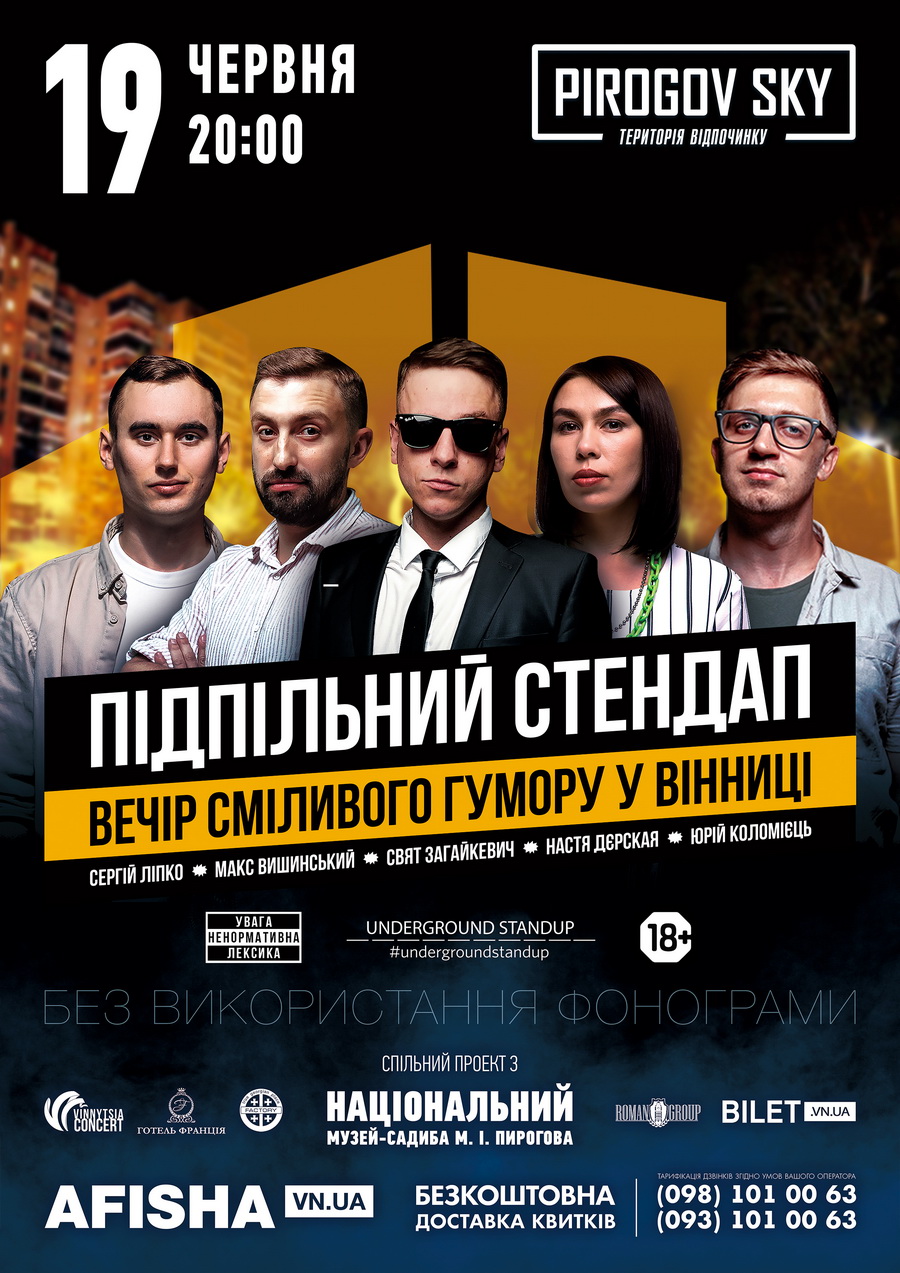19 червня о 20:00 просто неба у музеї-садибі Пирогова стендап коміки «Підпільного» дадуть такого жару та драйву, що вся Вінниця буде гудіти та згадувати ще довго!!!