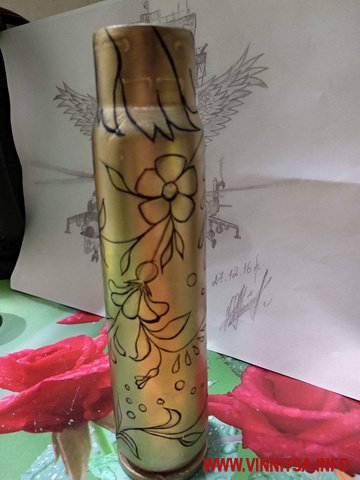 «У 2015 році, коли знаходився на бойовій позиції «Зеніт», відчув, що необхідно розвантажитися психологічно. У руки потрапила болванка від використаної міни. Я її розмалював українським орнаментом. Потім ще одну, і ще. Спробував і на гільзах нанести малюнки. Сподобалося.  Творчість не покинув і після того, як повернувся додому. Своєму знайомому колись пообіцяв, що зроблю подарунок . От після цього пішло-поїхало», - розповідає Вінниця.info Олександр.