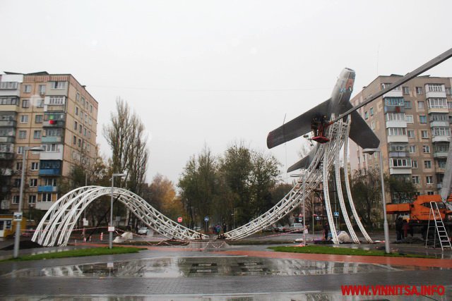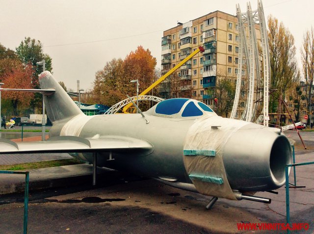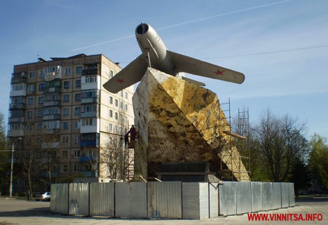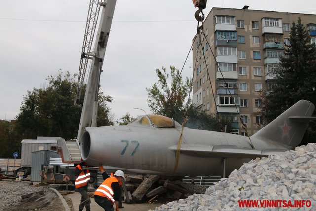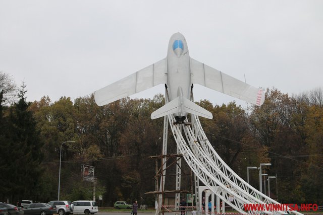 Минулої осені у Вінниці розпочали реконструкцію площі Костянтина Могилка. Спершу там планували провести благоустрій території, встановити лавочки, перголи, постелити плитку і змонтувати «сухий» фонтан. Згідно проекту, постамент з літаком мав залишитися на своєму місці і у звичному вигляді. Однак, 10 жовтня винищувач зняли з «п’єдесталу», щоб відремонтувати.