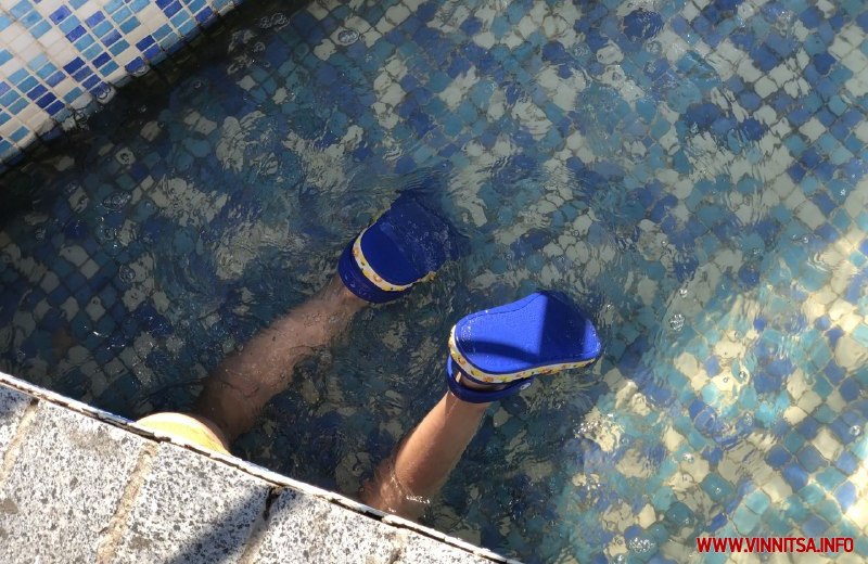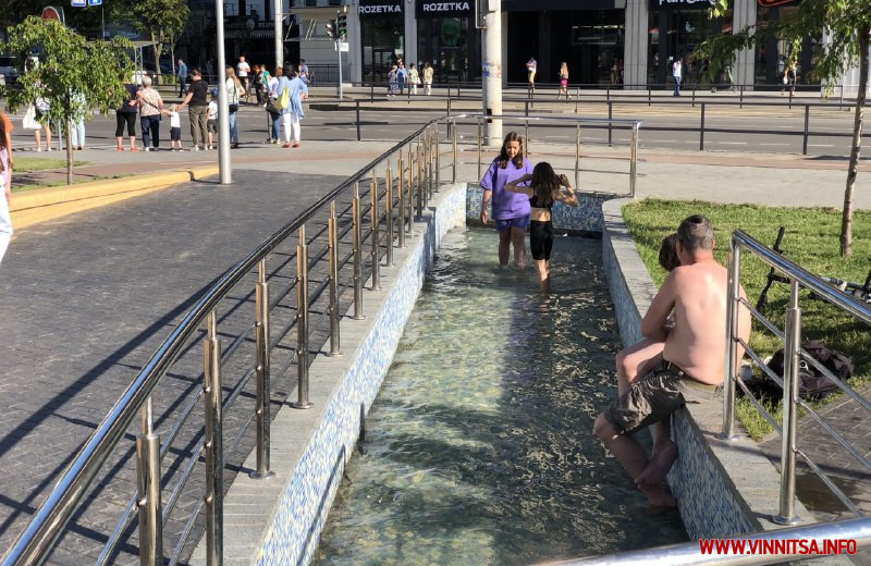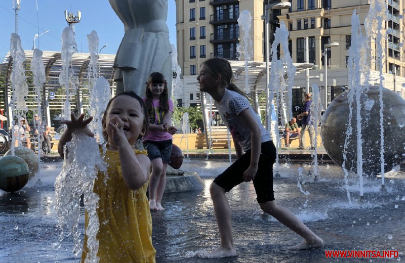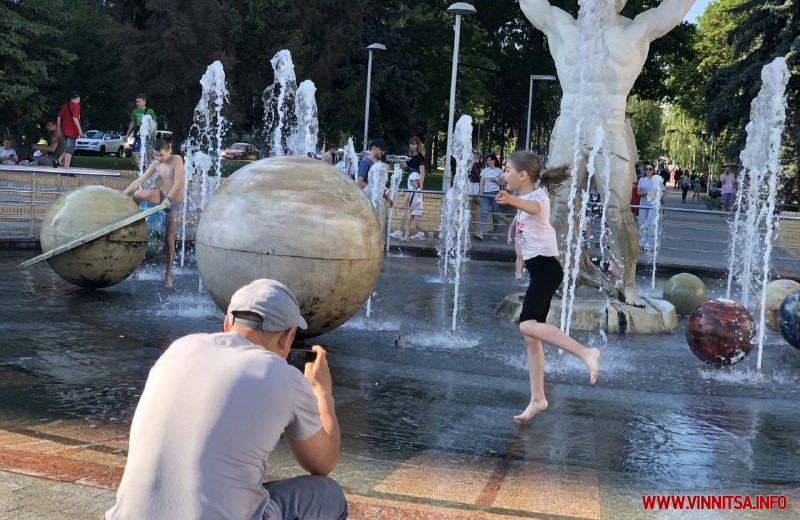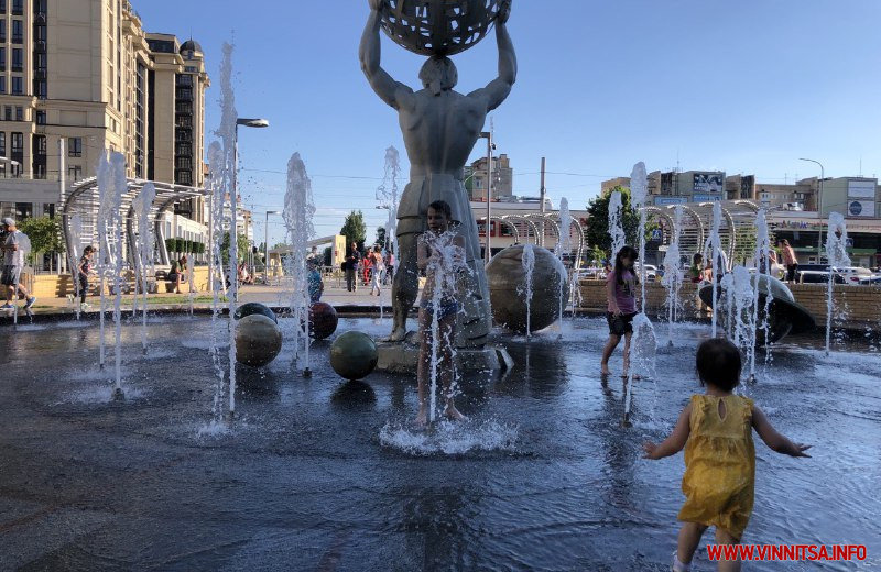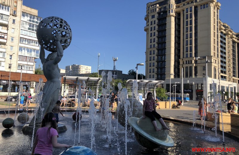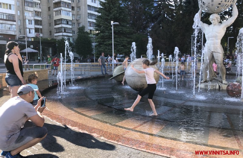 У Вінниці, в спекотний червневий день, біля фонтану з Атлантом та планетами, розважаються діти і відпочивають дорослі.