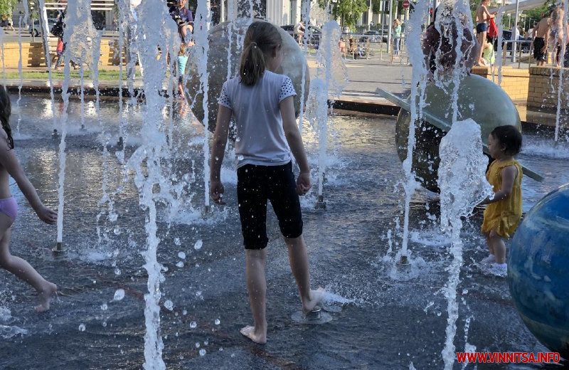 Діти купаються у фонтані і бігають між струменями води. А дорослі в свою чергу намагаються зловити ці щасливі моменти фотографуючи малечу.