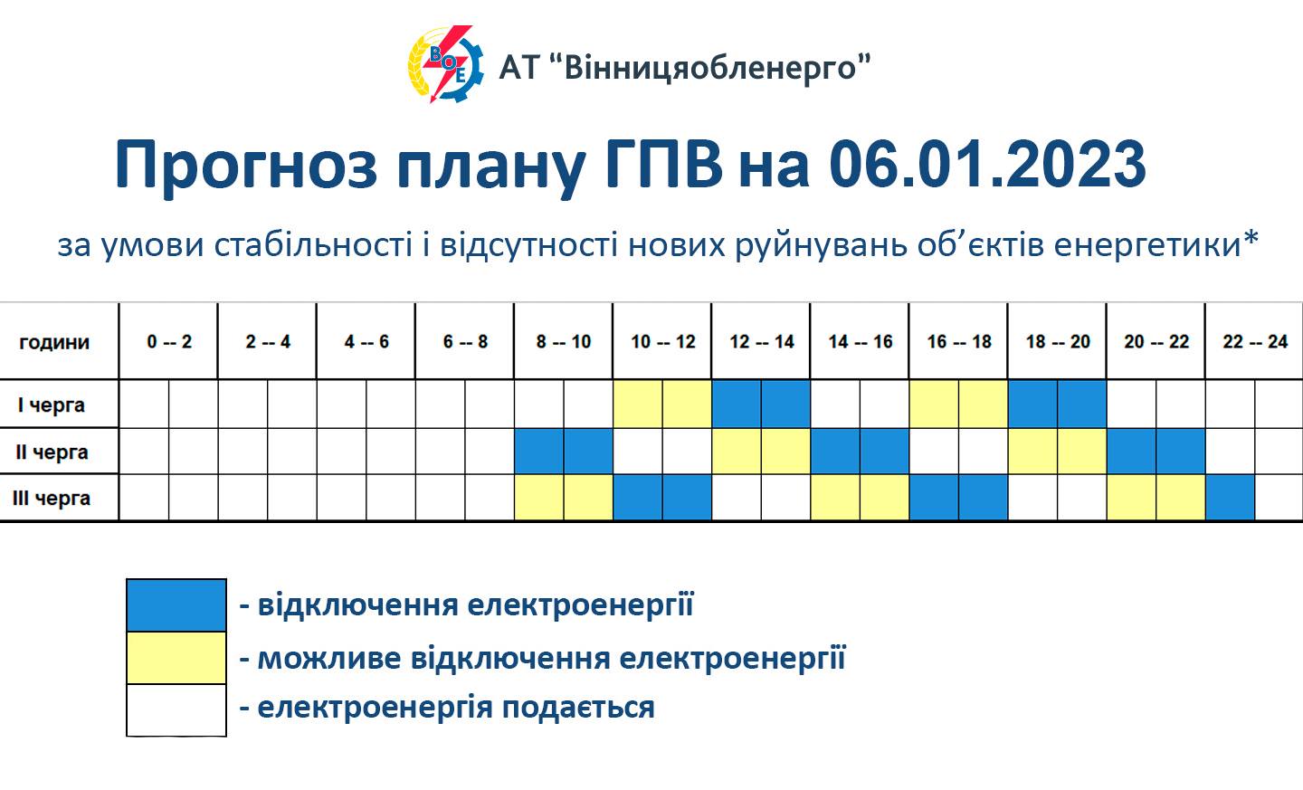 Відповідно до доведеної граничної величини споживання електричної потужності на 6січня по Вінницькій області задіяно обмеження електроспоживання відповідно до графіка погодинного відключення.