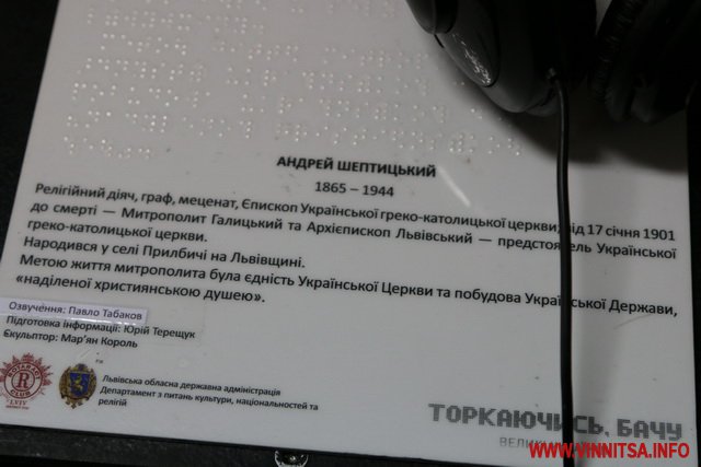 11 березня у Вінниці розпочала роботу унікальна виставка для незрячих - «Торкаючись, бачу: великі українці». В залі краєзнавчого музею представили бюсти 12 відомих українців, кожен з яких супроводжується надписом шрифтом Брайля і аудіоозвученням. Тексти про земляків читали Тіна Кароль, Олександр Пономароьв, Павло Табаков та інші виконавці.