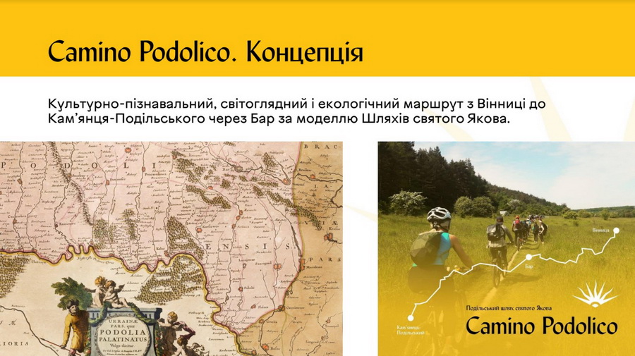 «Культурно-туристичний маршрут Camino Podolico – проект, який не просто дозволить усім охочим пройти пішки або проїхати велосипедом 250 з лишком кілометрів, а й відпочити на фоні мальовничої природи й атмосферних сіл і містечок у садибах та економготелях, які створюють мешканці. Такий туризм може бути вигідний не лише мандрівникам, а й місцевим, значно покращуючи економіку у громаді і спонукаючи туристів залишатися на ночівлю.