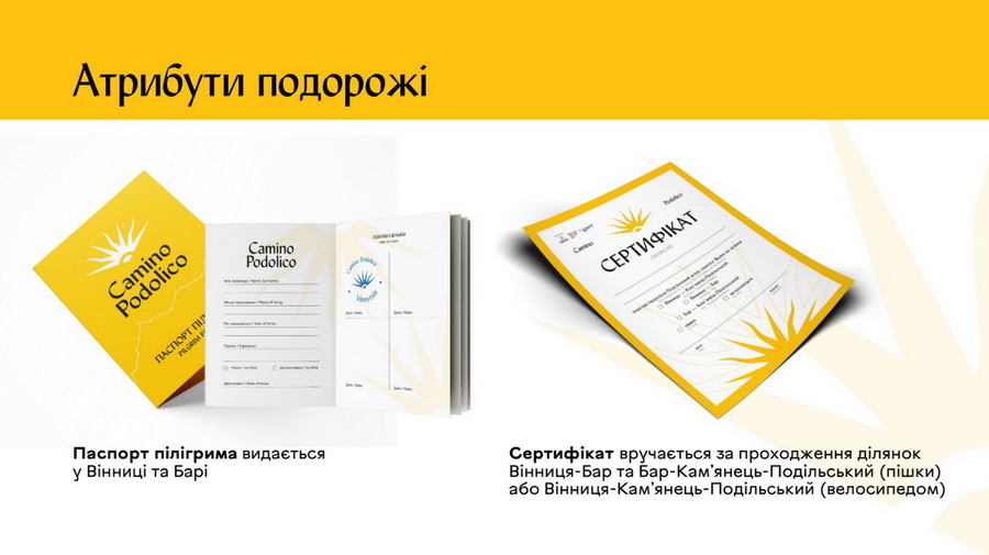 Мандрівникам, що будуть йти шляхом, у відповідно зазначених місцях будуть ставити печатки у паспорт. У більшості випадків це будуть робити у храмах, культурних установах та місцях ночівлі. У містах Бар і Кам’янець-Подільський подорожуючим, що пройдуть маршрут пішки і назбирають у свій паспорт відповідну кількість печаток без переривання мандрівки, видаватимуть сертифікат про проходження маршруту. Для велосипедистів сертифікат видаватимуть лише у Кам’янці-Подільському за проходження всього маршруту без перерв. Також власники паспортів зможуть у день прибуття відвідати ряд міських музеїв Кам’янця-Подільського безкоштовно.