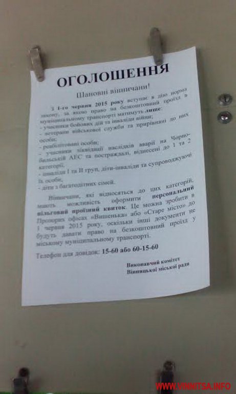 Як відомо, з 1 червня 2015 року буде скасовано пільговий проїзд в громадському транспорті. У Вінниці для того щоб скористатись пільговим проїздом, необхідно оформити проїзні квитки, звернувшись до Прозорих офісів з 6 квітня. Інші документи, такі як «пенсійне», чи інше посвідчення, не даватимуть право на безкоштовний проїзд.