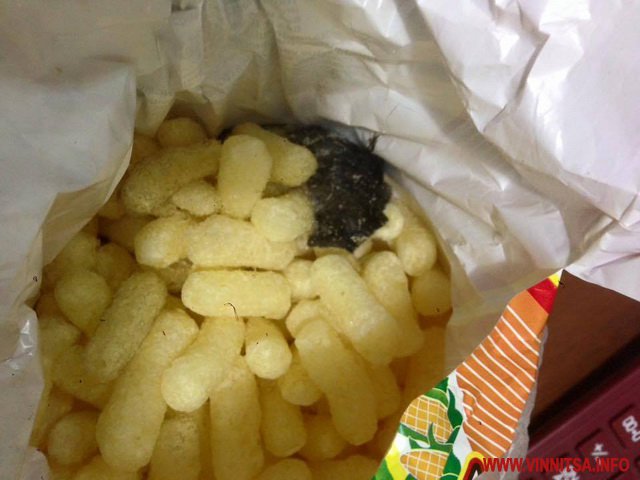 На Вінниччині під Калинівкою у магазині, який розташований у військовому містечку, 7 грудня люди придбали кукурудзяні палички, в яких знайшли дохлу мишу.