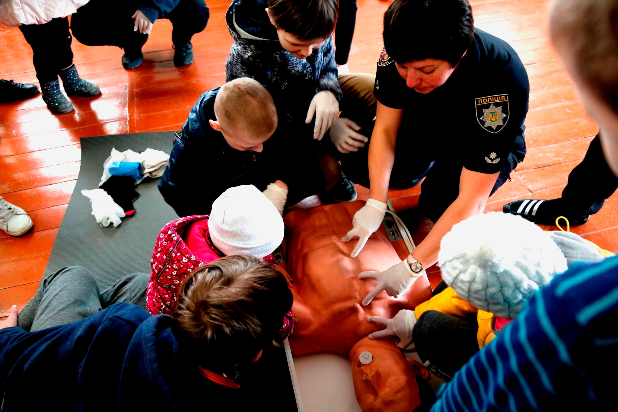 Поліцейські Вінниччини організували для дітей-переселенців та їх батьків корисний та інформаційний захід з надання домедичної допомоги. Поліцейські практикувались із присутніми зупиняти кровотечу, проводити серцево-легеневу реанімацію, евакуювати травмованого до безпечного місця.