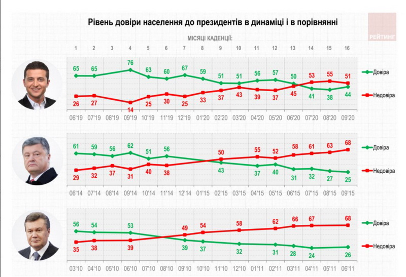 За результатами опитування, рейтинг довіри серед ключових національних політиків очолює Президент В. Зеленський - 44% опитаних довіряють Главі держави. 51% – не довіряють. Ю. Бойку довіряють 24%, не довіряють – 58%, Ю. Тимошенко довіряють 22%, не довіряють – 74%, П. Порошенку довіряють 22%, не довіряють – 75%. Рівень довіри до Президента В. Зеленського (44%) вищий, аніж за аналогічний період каденції мали президенти П. Порошенко (25%) та В. Янукович (26%).