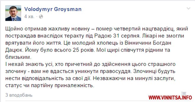 «В центральному госпіталі МВС помер ще один поранений 31 серпня 2015 р. під ВР - Богдан Дацюк. Весь цей час він знаходився в комі. На жаль лікарям не вдалося врятувати його життя.
