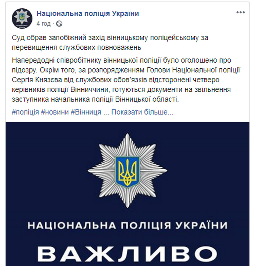 Прес-служба Національної поліції інформує, що Сергій Князєв відсторонив від службових обов’язків чотирьох керівників поліції Вінниччини, готуються документи на звільнення заступника начальника поліції Вінницької області.