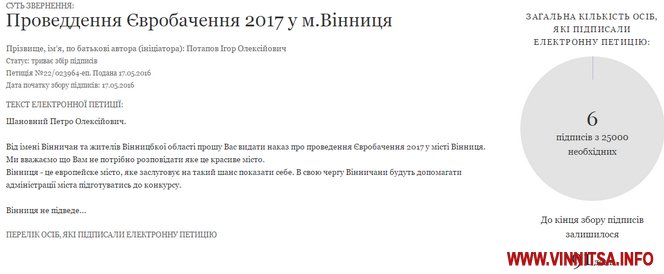 Вінничани навіть спробували зареєструвати відповідну петицію до міської ради, однак адміністратори відмовили, оскільки такі питання не в компетенції мерії. 17 травня електронне звернення з назвою «Проведення Євробачення 2017 у м.Вінниця» з’явилося на сайті Президента України. За два дні його підтримали тільки 6 осіб із 25 тисяч необхідних для розгляду.