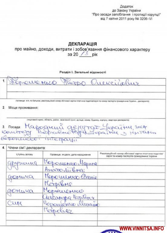 Така інформація міститься в декларації Порошенка, оприлюдненій на сайті ЦВК.