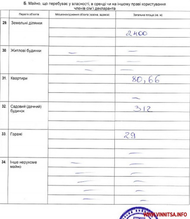 Родина Порошенка має земельну ділянку площею 2400 квадратних метри, квартиру площею 80,66 квадратних метри, садовий будинок площею 312 квадратних метри і гараж на 29 квадратних метри.
