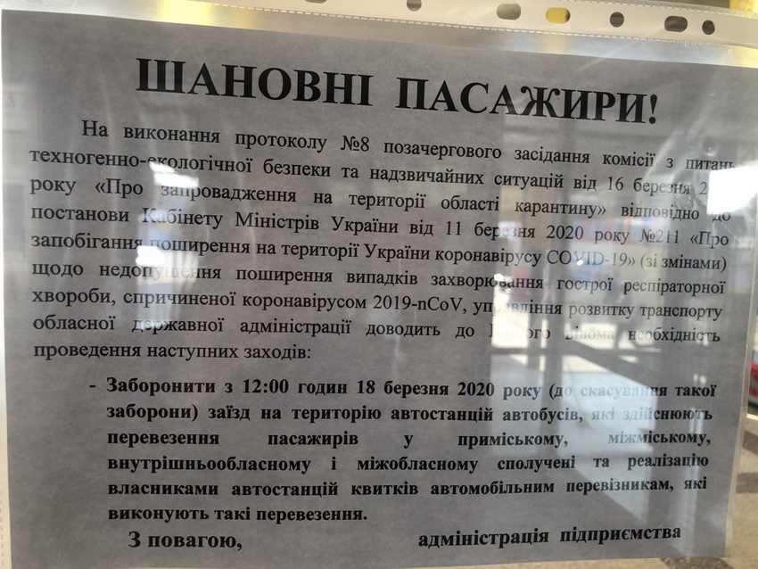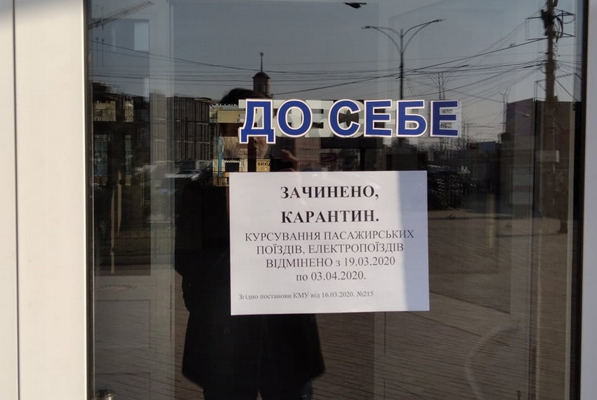 Від сьогодні центральний вхід до приміщення залізничного вокзалу зачинений. Як і до зали очікування з боку квиткових кас. Фактично, працюють лише каси, аби люди могли повернути квитки. Відповідне повідомлення висить на центральному вході і на дверях кас. В повідомленні зазначається, що курсування електропоїздів та пасажирських відмінено з 19.03 по 03.04. Але, відповідно до постанови Уряду, виїхати пасажирським транспортом неможливо вже від сьогодні після 12:00.