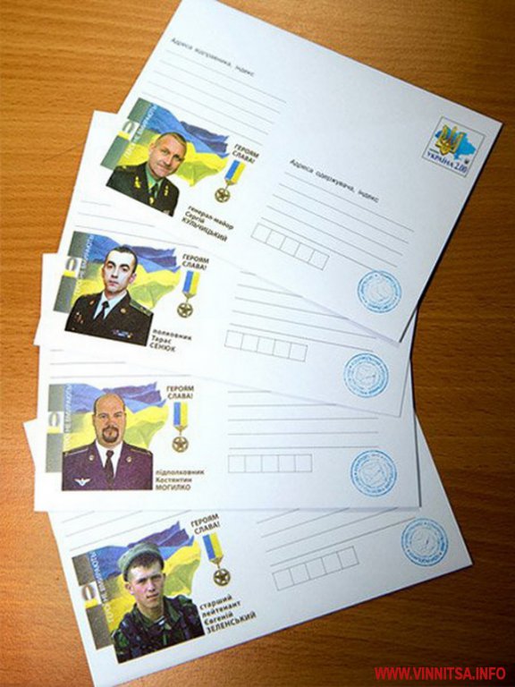 На перших чотирьох конвертах зображені загиблі в зоні проведення антитерористичної операції на Донбасі українські військовослужбовці, яким було присвоєно звання Героя України: генерал-майор Сергій Кульчицький, полковник Тарас Сенюк, підполковник Костянтин Могилко і старший лейтенант Євген Зеленський.